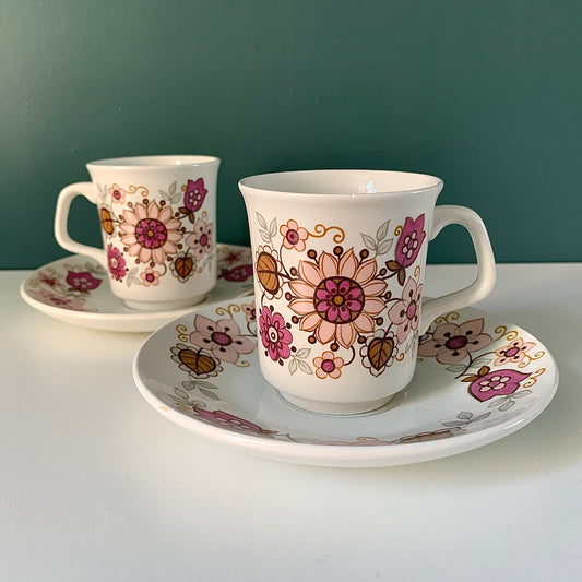 J&G Meakin Filigree Pink Ceramic Espresso Cups & Saucers British English 1960s 1970s Gifts Presents
