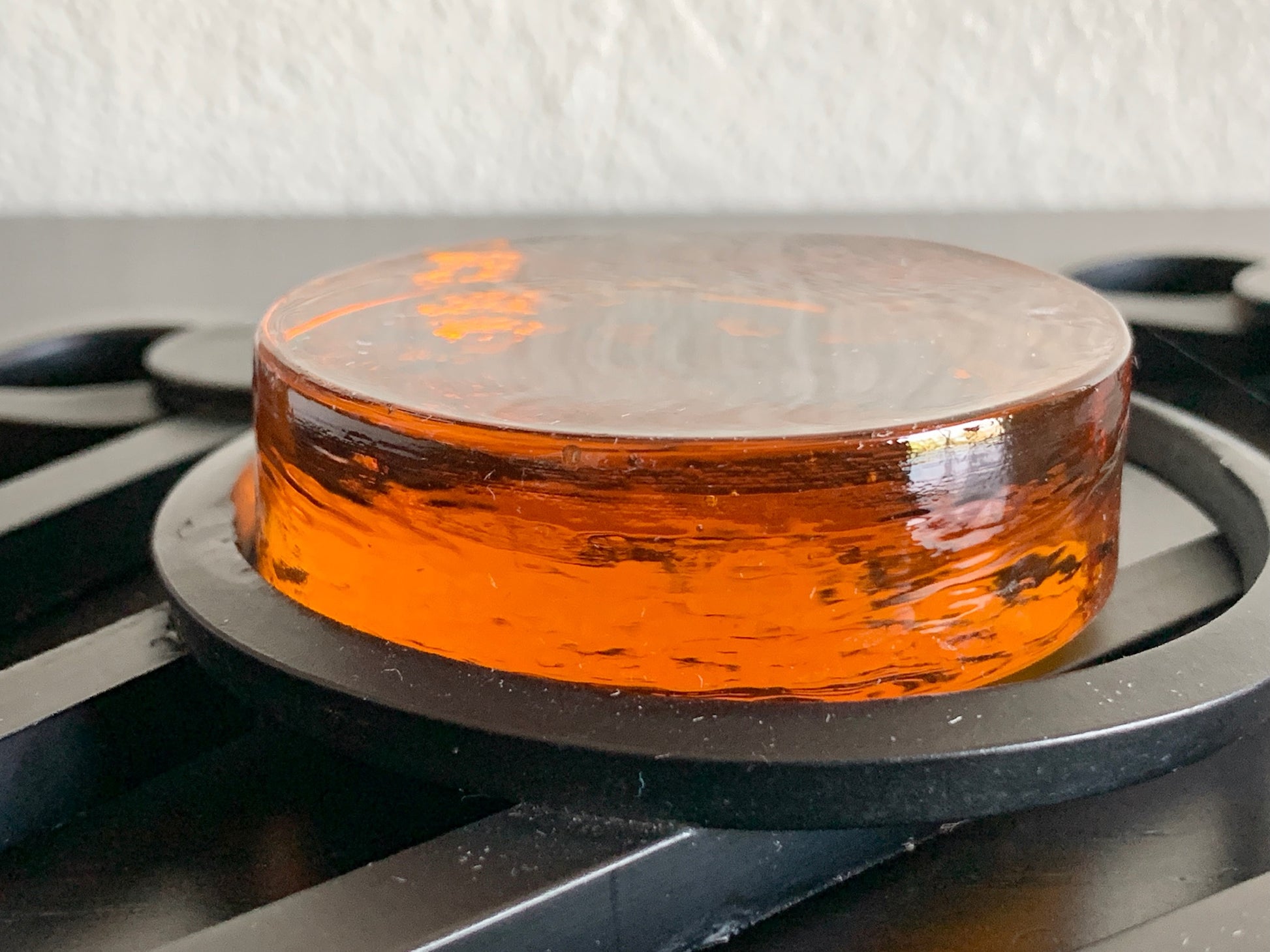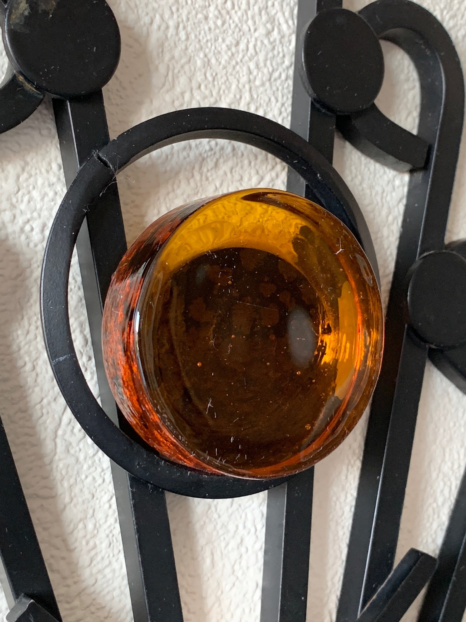 Made of lacquered wrought iron with a round amber chunk of beautiful architectural glass.