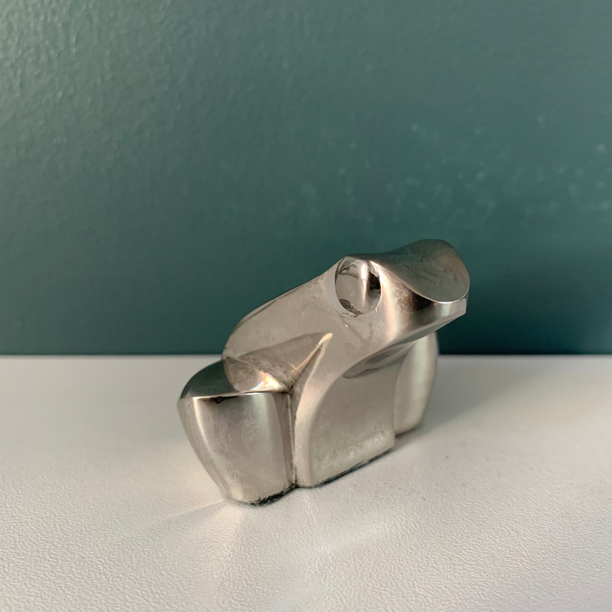 This cute paperweight is made of silver-plated zinc.