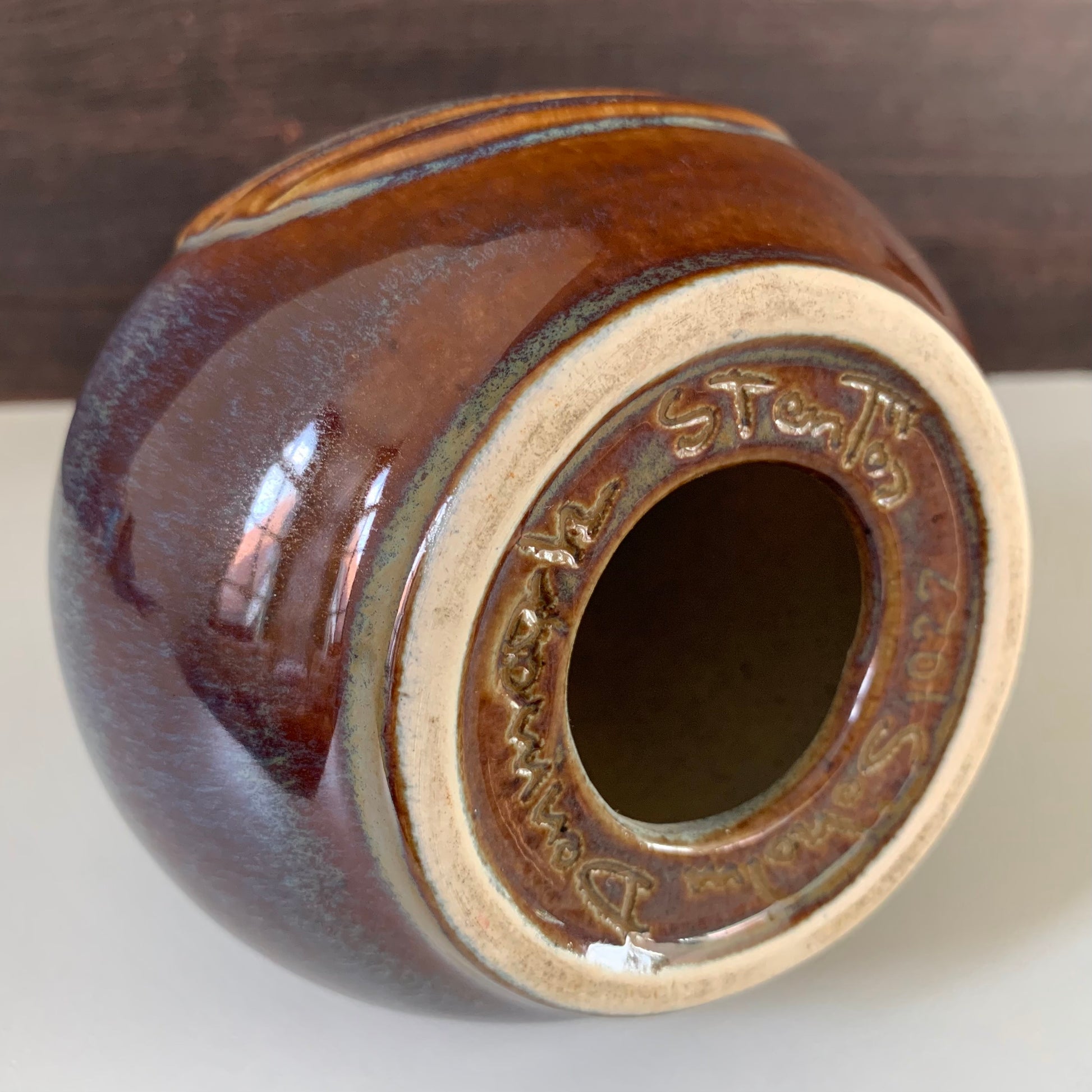 Features a glossy glaze in purple and amber with light yellow and sea green highlights.