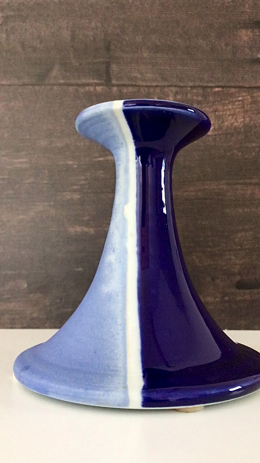 Features a mix of glossy dark blue glaze and matt light blue hare's fur glaze.
